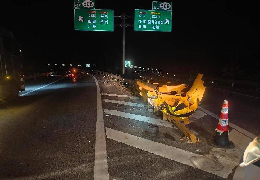 时隔仅5天,类似的危险场景再度上演。2025年12月8日00时40分许,G65线包茂高速临桂段分岔口,一辆轻型仓栅式货车行经此处时,突然撞击分流鼻护栏,车辆因剧烈撞击严重受损,随后横停在行车道上。彼时正值夜间,视线条件极差,横停的事故车辆如同“路障”,给过往车辆带来极大安全隐患,现场情况十分危急。